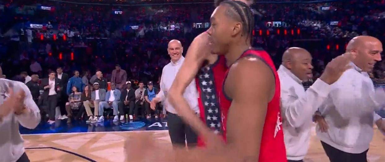 首场比赛在北京时间2月16日早上6点准时开打,对阵双方是“世界队”和“美国新星队”。 世界队的首发阵容是:维克托·文班亚马、德尼·阿夫迪亚、尼古拉·约基奇、贾马尔·穆雷和卢卡·东契奇。 美国新星队的先发五虎是:德文·布克、凯德·坎宁安、杰伦·杜伦、安东尼·爱德华兹和泰雷斯·马克西。 比赛一开始,气氛就不对劲。 跳球后,文班亚马迅速在低位要位,接球后一个转身,隔着防守队员就把球狠狠砸进了篮筐。 下一个回合,他又拉到外线,接到传球后毫不犹豫,张手命中一记三分球。 防守端,他长臂一挥,送给了试图上篮的对手一记大帽。 开场短短几分钟,文班亚马一个人包揽了世界队的前7分,攻防两端存在感十足。 他赛前说过,只要他上场,就绝不会故意输球或毫不在意输赢,他一定会真打。 从第一秒起,他就在兑现自己的承诺。