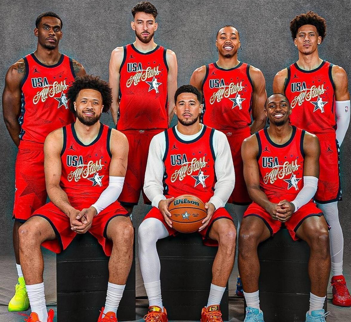 比赛开始后,星条队的老将们迅速进入状态。 凯文·杜兰特一攻一传,为球队打开局面。 勒布朗·詹姆斯和科怀·伦纳德接连在外线命中三分球,带领星条队打出一波8比0的攻势,建立了场上的主动权。 美国新星队这边则显得更有活力,他们不断冲击内线,试图用速度和激情来对抗老将们的经验。 杰伦·约翰逊命中一记三分,为新星队稳住阵脚。